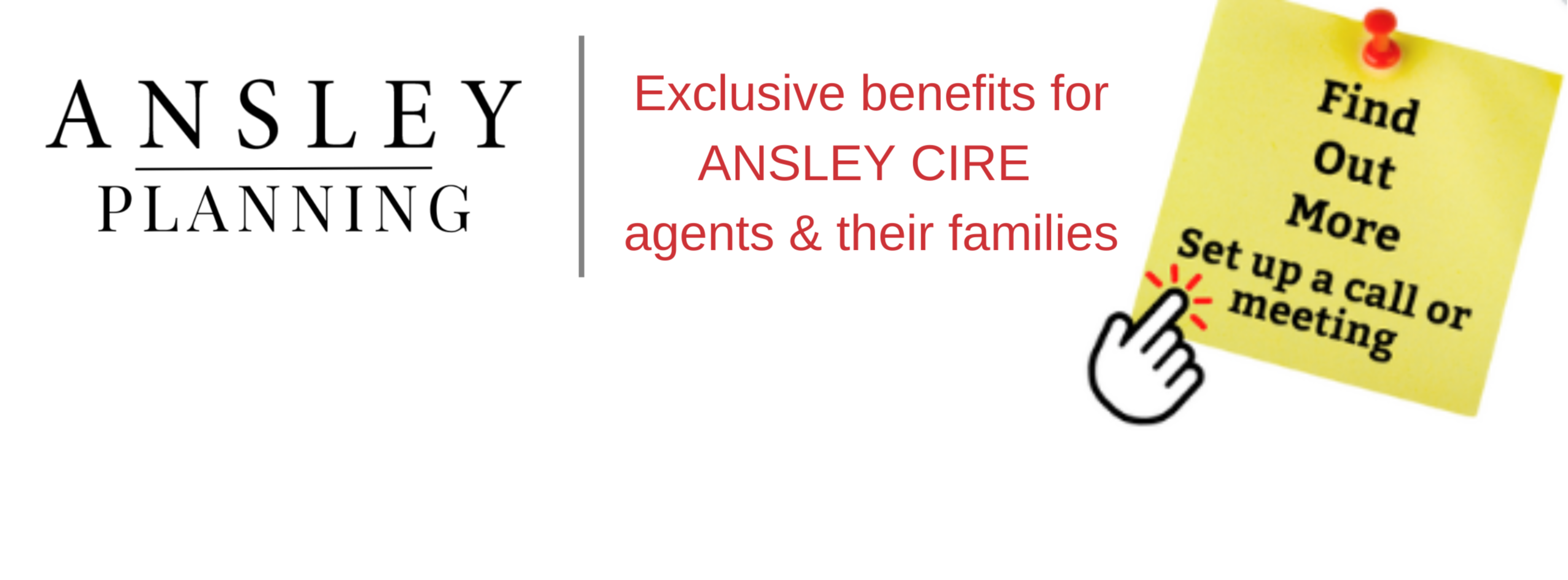 Stop waiting. Start saving.RETIREMENT PLANNING STRATEGIESAt the cornerstone of any retirement plan is a strategy designed to meet individual needs and goals. Providing Ansley agents the opportunity to direct a portion of each commission check to a personalized retirement plan makes saving for retirement simple and easy.ONECLICKYour life, now and in the future, in one central, secure location. Think of this as a vault with reactive and predictive capabilities.LONG-TERM DISABILITY INCOME PROTECTIONProvides income benefits if an accident or illness prevents you from earning an income. Ansley agents may receive up to a 50% discount on premiums and benefits are tax-free. In general, coverage continues until you can return to work as an agent or until you are no longer working full-time as an agent.LIFE INSURANCEAccess to a variety of life insurance products to meet your needs, including term insurance, universal life insurance, and variable life insurance. In many cases, accelerated underwriting without a blood or urine testing is an option. LONG-TERM CAREOptions for custodial care at home, at an assisted living facility, or in a nursing home to assist with non-medical daily living activities such as bathing, dressing, or eating. Ansley CIRE offers its agents access to long-term care policies with up to a 55% discount on premiums and may be tax deductible.MEDICAL/DENTAL/VISIONAccess to a unique group medical insurance option through Blue Cross/Blue Shield with vision coverage through VSP and dental through Principal. Available for single and family coverage with unlimited lifetime maximums and 100% preventive care and flexibility with access to national network of providers both in-and-out-of-network. CLICK HERE to schedule an easy intro call to learn more about options available through Ansley Planning or call or email Charles Rosen224.277.8798 | charlie@MJATeam.com